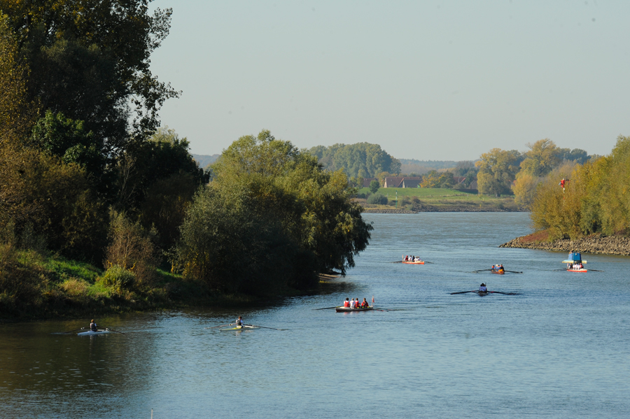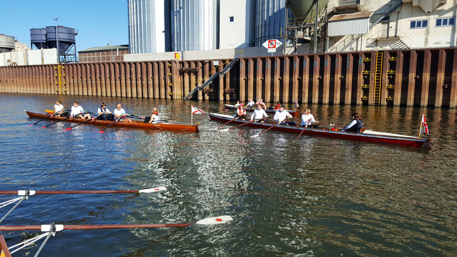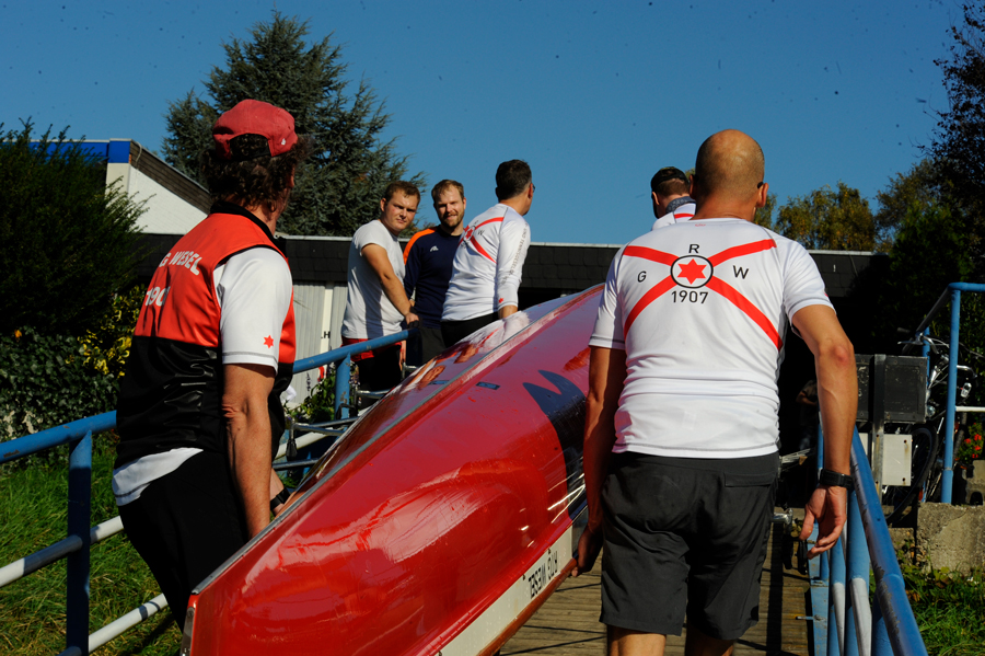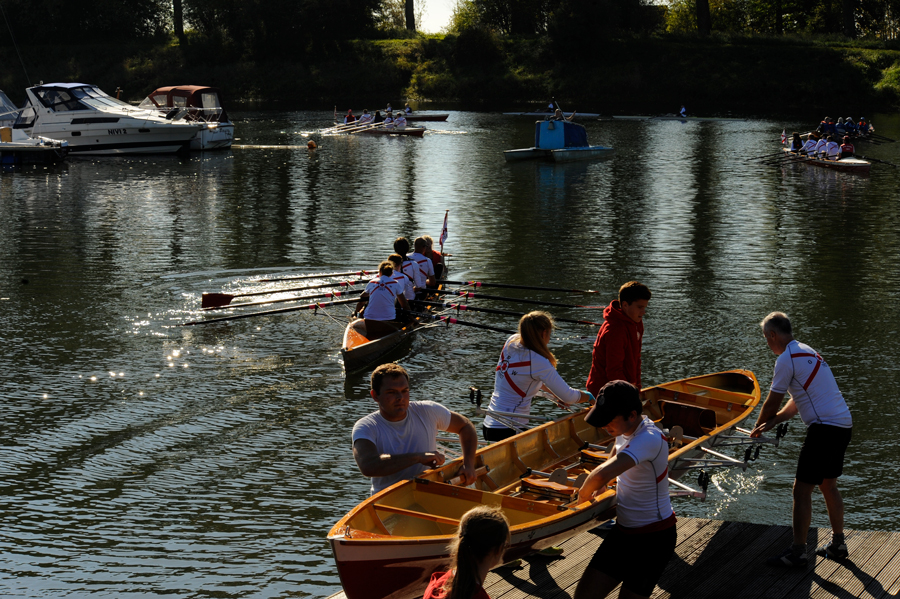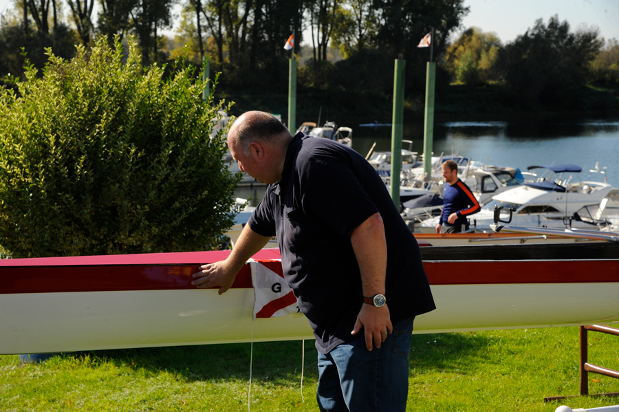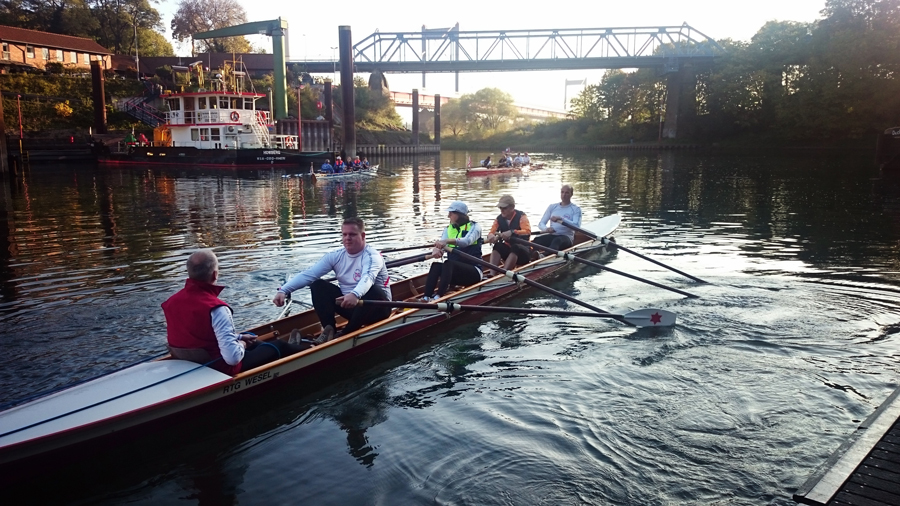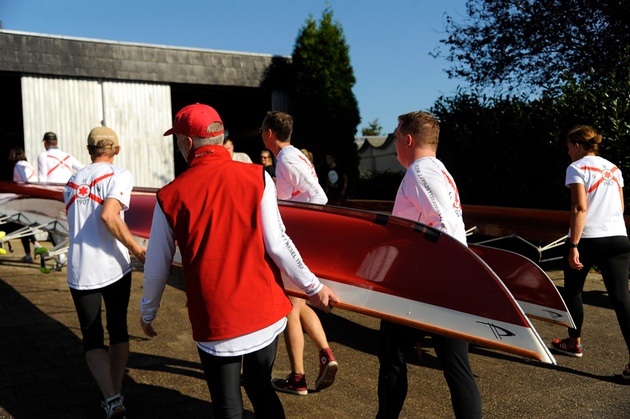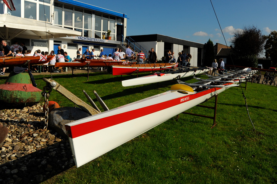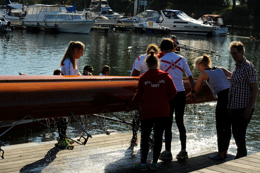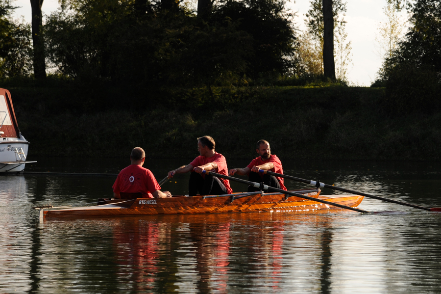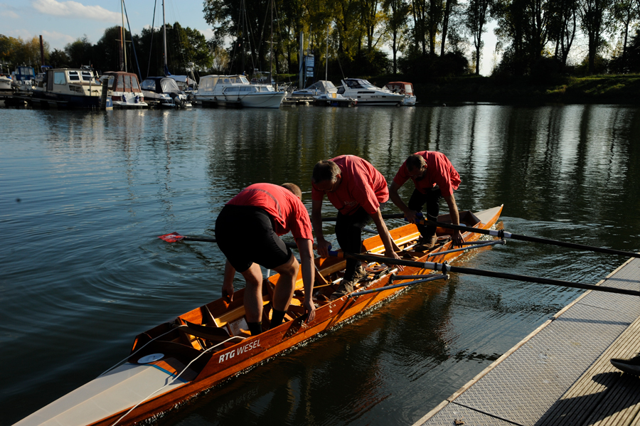 Weitere vier Boote, besetzt von rot-weißen Ruderern, sowie weitere vier Mannschaften in blauen Trikots steuerten um die mittagszeit in den Yachthafen. Am frühen, frühen Samstagmorgen stiegen 19 Weseler und 18 Homberger in Homberg in ihre Boote und ruderten die 37 Kilometer stromab in den Hafen und nahmen Kurs auf den Steg der RTGW.