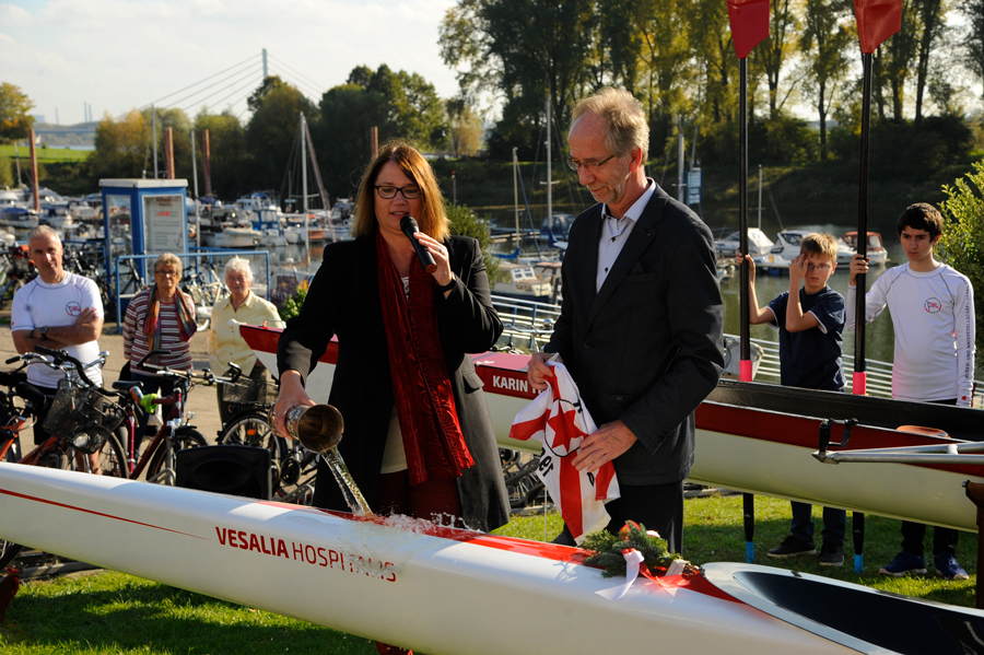 Den Abschluss bildete die Taufe des neuen Doppelvierers. Bürgermeisterin Ulrike Westkamp und Sparkassen-Vertreter Reinhard Hoffacker taufen das Boot auf den Namen „Vesalia hospitalis“. Und dann, finally, ließ es sich der Ältestenratsvorsitzende Wulf Kosthorst natürlich nicht nehmen, der Ruderabteilung seinen Dank auszusprechen und die Saison mit einem dreifachen Hipp-hipp-hurra zu beenden.