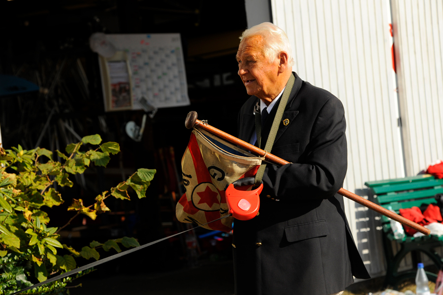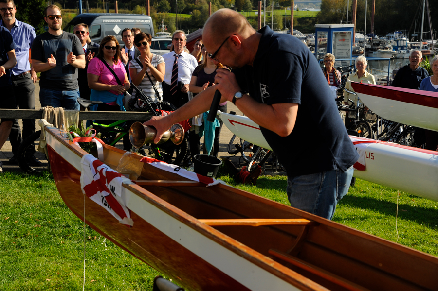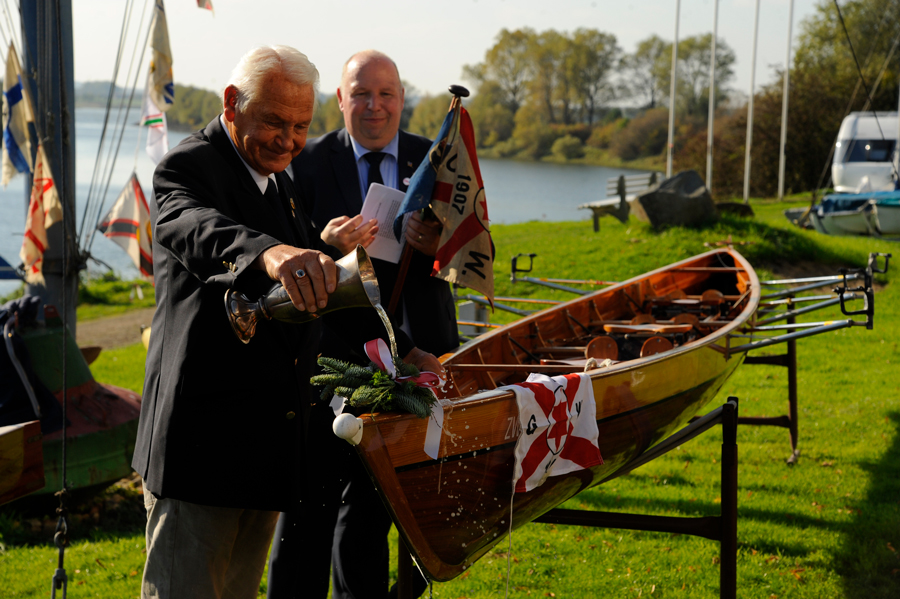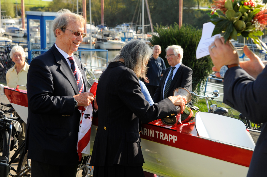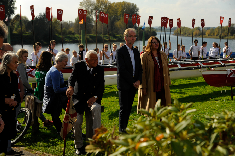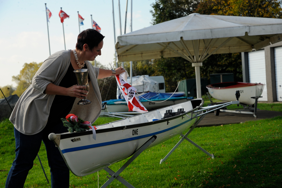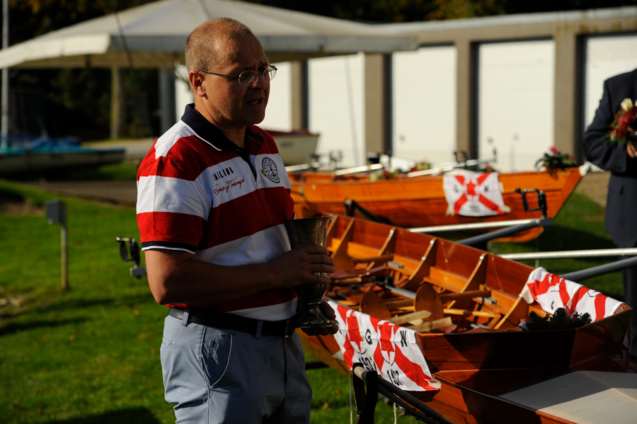 Nach den Worten der Bürgermeisterin kamen wir nun zu grandiosen sieben (!!!) Bootstaufen. Keiner kann sich an eine größere Taufaktion erinnern. Jasmin von Blomberg taufte den neuen (gebrauchten) Trainer-Katamaran auf den Namen „Kat-ze“. Robi Winterhoff, gerade mit der Goldnadel des Clubs für seine 40-jährige Mitgliedschaft ausgezeichnet, taufte im Namen seiner Familie mit bewegenden Worten einen Holzzweier auf den Namen seiner Mutter „Berthild Winterhoff“. Robis Frau, Natascha Winterhoff-Kraatz, war übrigens das Geburtstagskind des Tages. Ina Pfeifer gab einem C-Einer den Namen „One“. Anschließend übergab die schon sehr lange der RTGW verbundene Familie Trapp der Ruderabteilung einen C-Achter. Nach den einleitenden Worten ihres Mannes Dr. Ernst Trapp taufte Karin Trapp den imposanten Achten mit bewegenden Worten auf ihren Namen. Eine besondere Verbindung besteht seit 1907 bereits zum Homberger Ruderklub Germania, denn damals gehörte ein Mitglied der Homberger zu den Gründern der Rudergesellschaft Wesel. Mit großer Freude taufte der Homberger Vorsitzende Kai-Uwe Holze einen Doppeldreier auf den Namen „Dreister“. Im Anschluss erhielt auch der zweite Dreier von Dieter Gerding, seit 66 Jahren Mitglied, seinen Namen: „Zweitdreister“. Gleichzeitig übergab er eine alte Bootsfahne aus den 50iger Jahren, die damals laut seinen Worten durch das Mitglied Jürgen Liman „akquiriert“ wurde. Nach dessen Tod wurde die Fahne von Dieter Gerding übernommen.