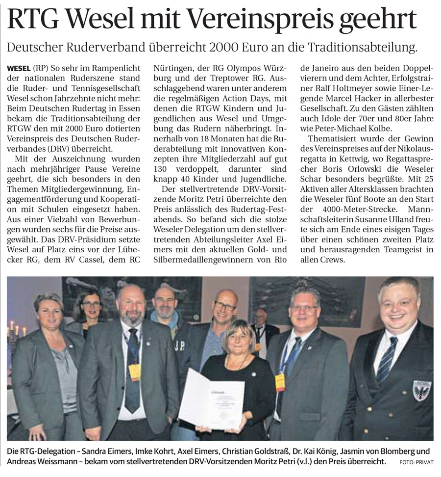 Spannend war es am Abend für die Weseler Delegation, die sich zum Eröffnungsabend des 63. Deutschen Rudertag nach Essen aufmachte. Die Ruderabteilung der RTGW hat sich beim Deutschen Ruderverband um den Vereinspreis des DRV beworben. Eine Jury hat die zahlreichen Bewerbungen durchforstet und bewertet. Der DRV prämiert ... More