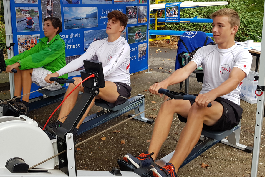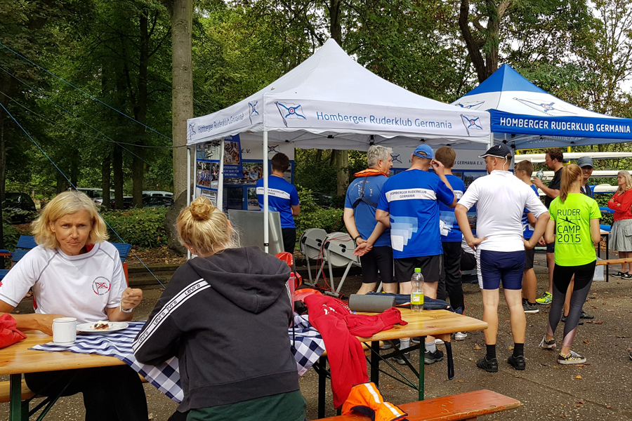 Rudern, soviel du schaffst – dafür sind wir angetreten. Wie immer, machen es unsere Freunde vom Ruderklub Germania Homberg nett! Wer nicht ruderte, hatte die Qual der Wahl am Büffet. Leckerer selbstgebackener Kuchen, Waffeln, Koteletts mit Kartoffelsalat oder Bratwürstchen lockten die Teilnehmer an die Stände. Für zwei unserer Junioren war es das erste Mal. Sie konnten es nebenbei auch nicht lassen, sich auf den aufgebauten Ergometer zu setzen. Mit 61 Kilometern hatten am Ende Imke und Jasmin zusammen mit zwei Hombergern die meisten Kilometer an diesem Tag gerudert.