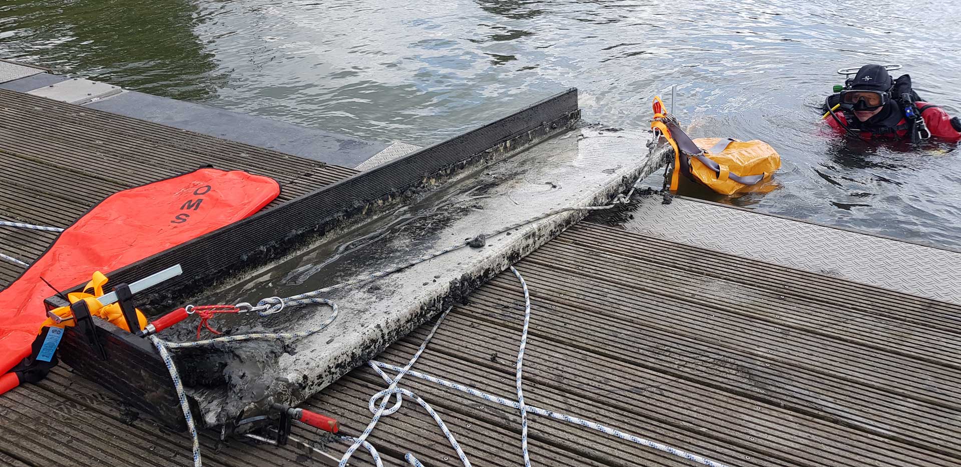 Über ein Jahr ist es her, dass unser abgesoffener Steg mit einem Kran geborgen, anschließend repariert und wieder zu Wasser gelassen wurde. Die bei der Bergung abgerutschen Holzflächen und Bleche konnten bei der ersten Unterwassersuche Dank zweier Weseler Tauchprofis gefunden und geborgen werden. Nur das letzte Trittb...