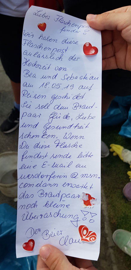 Bei einer Flaschenpost handelte es sich um einen Hochzeitgruß aus dem Jahr 2019, die dem Hochzeitspaar Glück bringen sollte. Die Flaschenpost war so gut geschlossen worden, dass das Öffnen sich als sehr schwierig erwies. Was das Brautpaar zu der Flaschenpost sagt, werden die Jugendlichen in Erfahrung bringen.