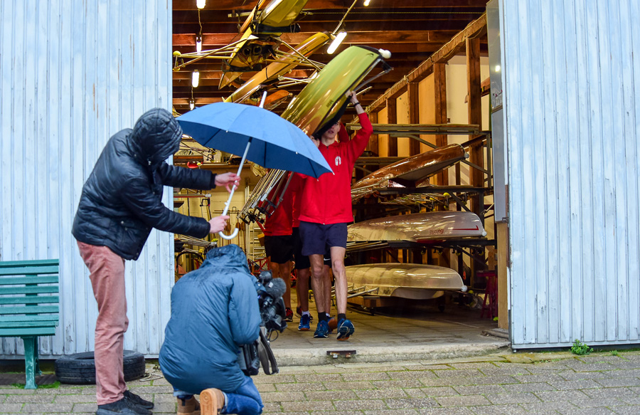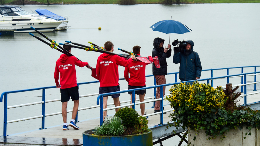Wie bereiten sich Ruderer eigentlich auf ihre Saison vor? Das wollte Maren Bednarczyk, Moderatorin des WDR Studios Duisburg wissen und kam kurzer Hand mit großem Aufgebot zu uns. Neben dem Ergometerrudern wurden noch Drehaufnahmen am Bootshaus aufgenommen. Hierzu setzten sich David Voortman, Christian Heikapell, Till Hansen und Tiago Jung mit kurzer Hose und Vereinsshirt kurzerhand in die Tequila Sunrise und zeigten Ausschnitte einer Trainingseinheit – und das bei miesestem nasskalten Wetter. Danach ging es rüber zum WTV.