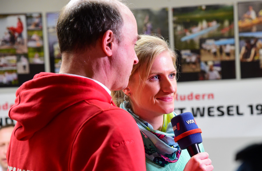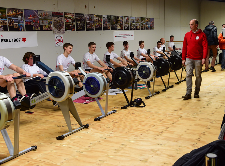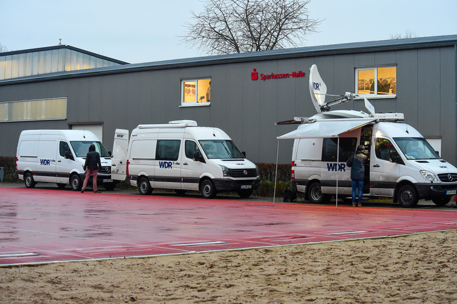 Volles Haus bot sich der WDR-Mannschaft: Jugendliche und Erwachsene trainierten gemeinsam auf den 15 Ergometern. Für die Sendung „Lokalzeit aus Duisburg“ waren vier-Live-Minuten zur Berichterstattung vorgesehen, die mit Bildern vom Training und Live-Interviews mit Horst Broß (Trainer) und Felix Eimers (jüngster Ruderer an diesem Abend) unterstützt wurden. Da die halbstündige Lokalszeit komplett von Wesel aus gesendet wurde, standen vor der Halle drei ausgestattete Technik- und Übertragungswagen – das ganze Studio zuzusagen auf Rädern. Rund 12 WDR-Mitarbeiter, wie Kameraleute, Aufnahmeleiter, Redakteure und Moderatorin u.v.a., waren in der Zeit beschäftigt – ein großes Aufgebot eben.