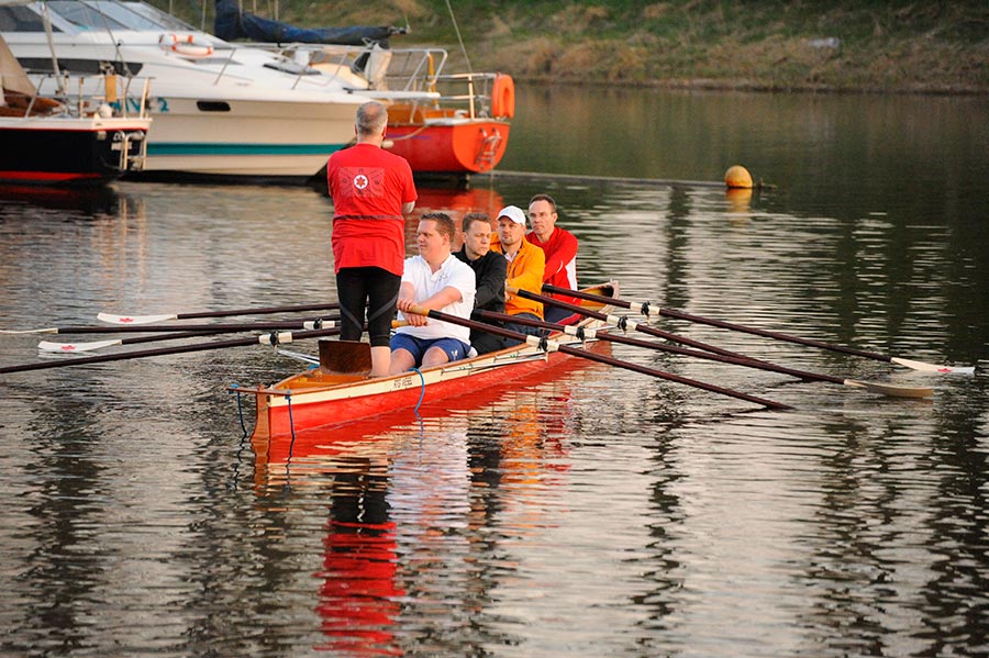 Am Bug beginnend melden die Sportler, sobald sie ruderbereit sind („1 fertig!“, „2 fertig!“, …).