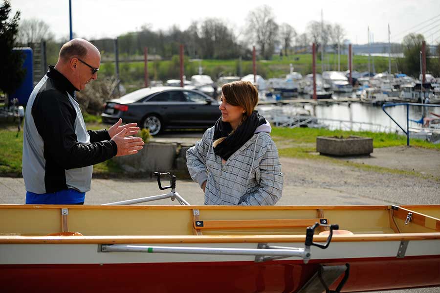 Und dann geht’s auch schon los. Es sieht so einfach aus, wie Nummer Drei – Karin Rüttgers – und Imke Kohrt – die Nummer Eins – ihre Skulls im Takt durch das Wasser ziehen und sich das Boot immer weiter vom Steg des Weseler Yachthafens entfernt. Rudern – „das ist ein absoluter Teamsport, bei dem man unkompliziert mit Leuten zusammenkommt. Und das ist auch das Schöne daran“, findet Karin Rüttgers. Vor neun Monaten hat die 55-Jährige bei der Ruder- und Tennisgesellschaft Wesel (RTGW) damit angefangen – aus Liebe zu Lebensgefährten Carsten Schwolow. „Aber auch, weil ich beruflich viel im Büro sitze. Ich muss etwas für meinen Körper tun.“ Rudern sei der perfekte Kraft- und Ausdauersport, erklärt Schwolow. Denn dabei trainiere man nicht nur so gut wie alle Muskelgruppen, sondern auch das Herz-Kreislauf-System. „Beim Rudern werden die Gelenke entlastet. Deshalb ist es gerade auch für Menschen mit Rücken- oder Knieproblemen geeignet.“ Schwolow selbst hat als Schüler angefangen. „Unser Direktor war 1936 Steuermann bei der Olympia-Mannschaft, da lag es nahe, dass er den Rudersport an unserer Schule fördert.“ Carsten Schwolow blieb dran, heute ist er Vorsitzender des RTGW.