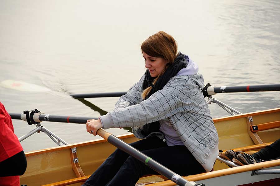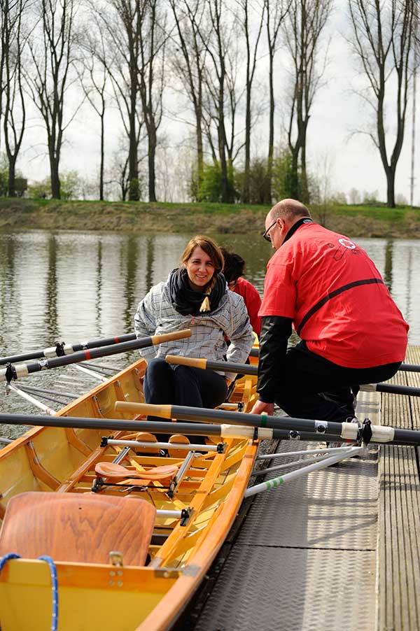 Mit etwa 60 Kilo ist unser Boot auch kein Leichtgewicht. Schon das Tragen zum Steg – natürlich in Teamarbeit – geht in die Arme, dafür bewegt es sich auf dem Wasser umso geschmeidiger. Die Segelboote und Yachten im Hafen lassen wir links liegen, rechts ziehen Wiesen und noch kahle Pappeln vorbei. Und dann schießt ein Vogel neben dem Boot ins Wasser, mit einem dicken Fisch im Schnabel schwingt er sich zurück ans Ufer. Die niederrheinische Landschaft sei ein Paradies für Ruderer, findet Imke Kohrt. „Die Strecke den Rhein entlang, runter bis zur Bislicher Insel in Xanten ist wunderschön. Wenn da die großen Schiffe an einem vorbeiziehen und die Sonne gerade untergeht – das ist atemberaubend.“ Und Wesel sei eine optimale Ausgangsbasis zum Rudern: „Wir haben den Rhein und den Auesee. Das ist schon etwas Besonderes. Welche Stadt hat noch einen See und ein Fließgewässer so nah beieinander? Und wenn’s mal regnet? „Auch im Regen kann man Rudern“, sagt Carsten Schwolow. Nur im Winter, wenn es draußen friert, bleiben die Boote drinnen. Ausgleichsprogramme können dann helfen, nicht aus der Übung zu kommen. Zum Beispiel auf dem Ruderergometer. Den Gedanken an schlechtes Wetter schieben die Ruderfreunde schnell beiseite. Jetzt startet erstmal die Rudersaison. Und dann frühmorgens durch die Nebelschwaden mit dem Boot über den Auesee gleiten. „Wenn es windstill und der See ganz ruhig ist, fühlt sich das wie Fliegen an“, schwärmt Carsten Schwolow. Vor zwei Jahren ist der 53-Jährige aus Düsseldorf nach Wesel gezogen und hat hier die perfekte Kulisse für seine Rudertouren gefunden. Und will auch andere dafür begeistern, vor allen Männer und Frauen ab Mitte 40. „Leute, die sich die Zeit nehmen wollen, neben dem Job etwas für ihren Körper zu tun.“ Die Voraussetzungen dafür? „Eine gewisse Grundbeweglichkeit muss da sein“, betont Carsten Schwolow. „Wer 20 Kilometer mit dem Fahrrad fahren kann, der kriegt das auch mit dem Rudern hin.“