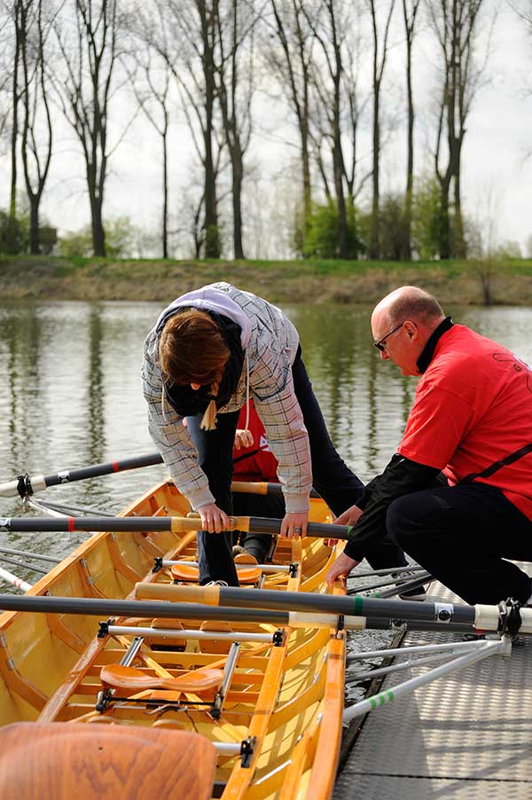 So leicht, wie es bei den zwei Mitstreiterinnen im Boot aussieht, ist das Rudern dann am Anfang aber doch nicht: Ständig kommen sich die Arme in die Quere; mal liegt der rechte, mal der linke Skull nicht richtig im Wasser. Und war das jetzt Steuerbord oder Backbord? Auch ganz ohne Vokabeln zu lernen geht es nicht. „Keine Sorge, das ist ganz normal“, beruhigt Karin Rüttgers. „Rudern ist eben auch Gehirngymnastik, man muss ständig koordinieren. Es fordert mental, am Anfang ist nach kurzer Zeit die Konzentration weg. Und am Ende ist man völlig ausgepowert…“Und dann will man immer mehr. Vor Kurzem hat Karin Rüttgers ihre erste Wanderrudertour gemacht. Was gemütlich klingt, ist in Wahrheit sportliche Höchstleistung: Von Dorsten aus ging es über die Lippe Richtung Krudenburg und Hünxe, weiter nach Wesel und dort an der Lippemündung in den Rhein bis zum heimischen Yachthafen. 40 Kilometer lang. „Da kommt man schon ins Schwitzen.“ Auch wenn man beim Wanderrudern längst nicht an das Schlagpensum der Rennruderer heran kommt. Etwa 40 Schläge pro Minute macht so ein Team. Bei der 2000-Meter-Regatta – die entspricht der olympischen Distanz – kommen die Sportler auf etwa sechs Minuten. „240 Schläge, bei jedem einzelnen zieht man sein eigenes Körper- und das anteilige Bootsgewicht“, weiß Carsten Schwolow. „Um die 100 Kilo können das schon mal sein.