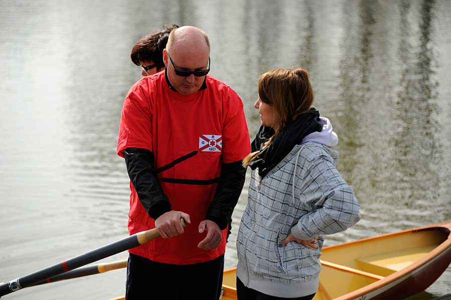 Noch bevor alle hintereinander in dem schmalen, langgezogenen Boot sitzen, sind wir schon beim Du. Schließlich geht es darum, im Team voran zu kommen. „Ab jetzt seid ihr aber nur noch Nummern. Beim Rudern ist das so“, sagt Steuermann Carsten Schwolow, während er sich vorne, am Bug des Dreiers aufbaut.