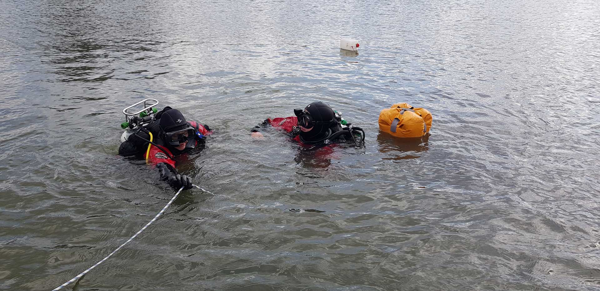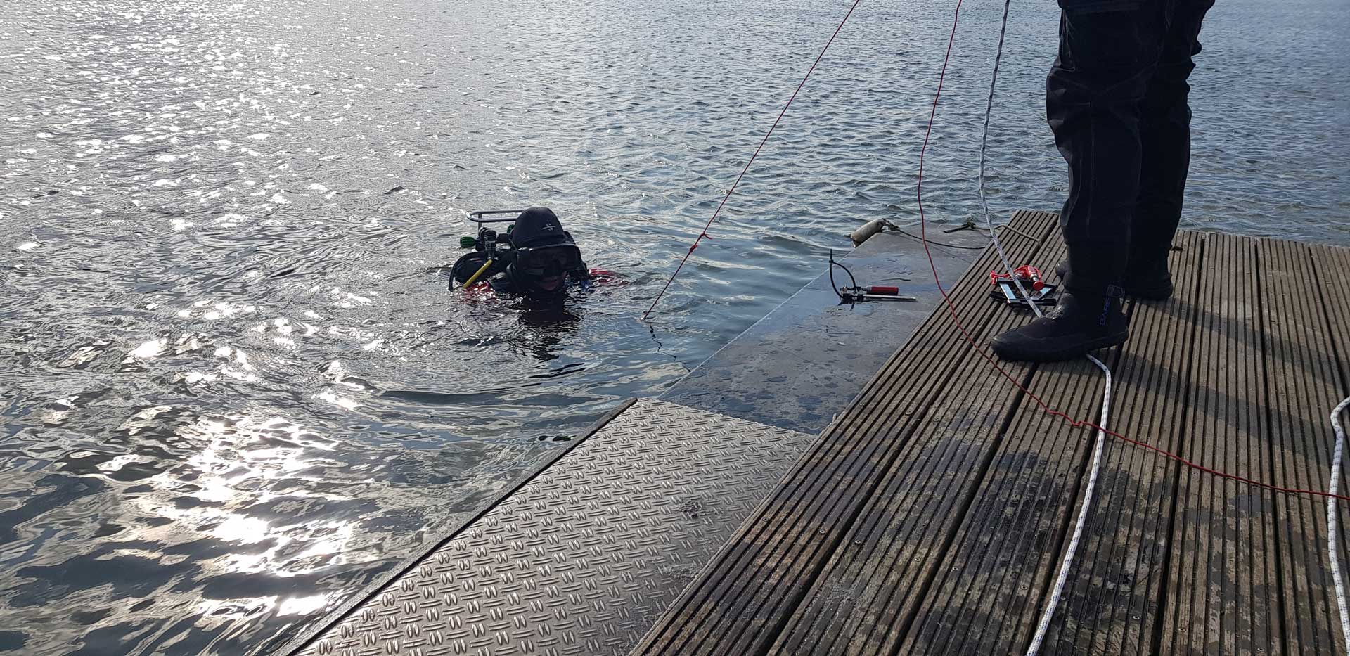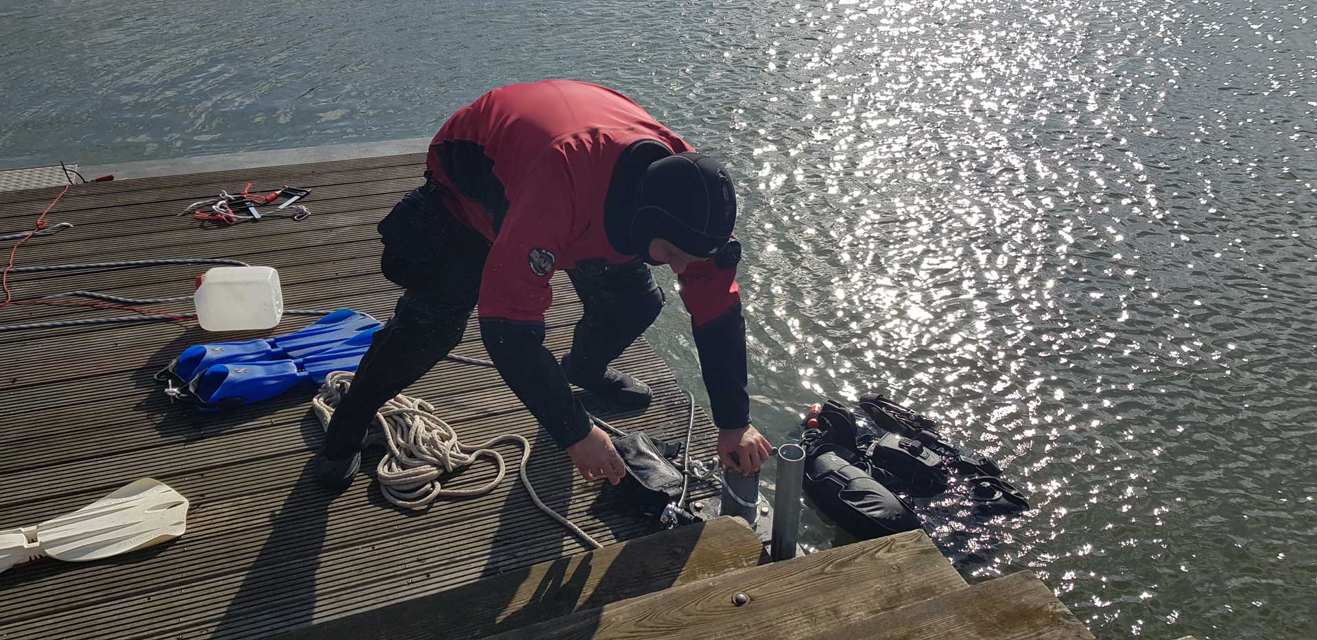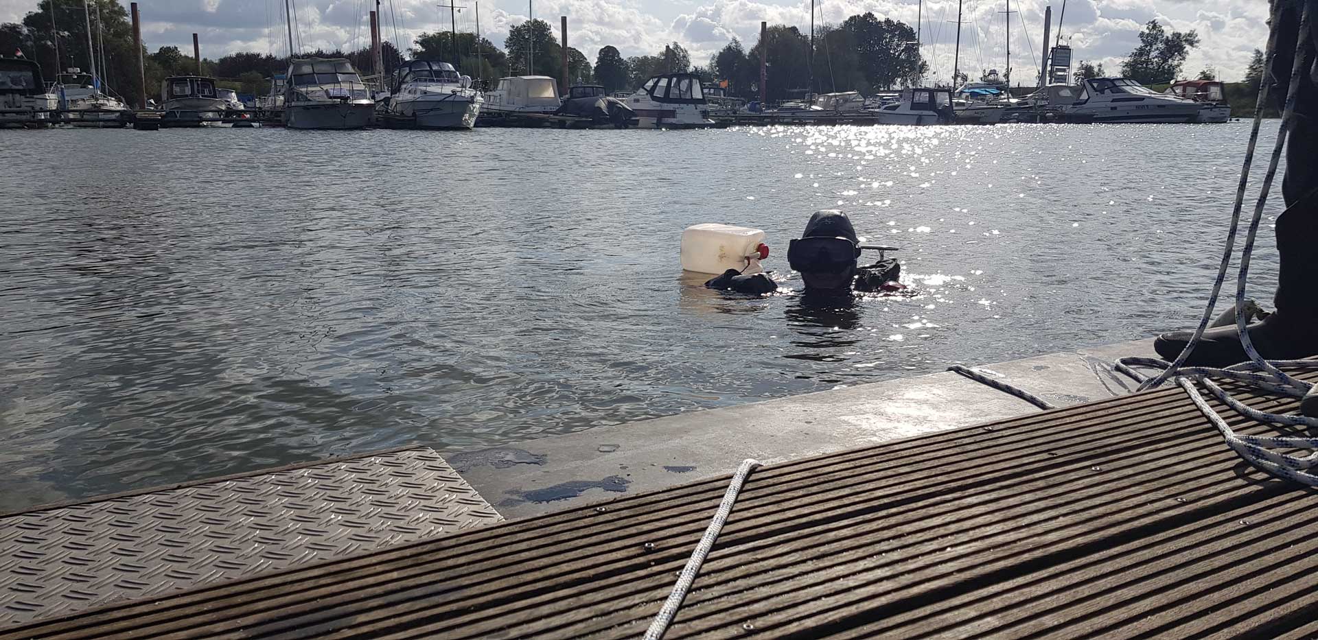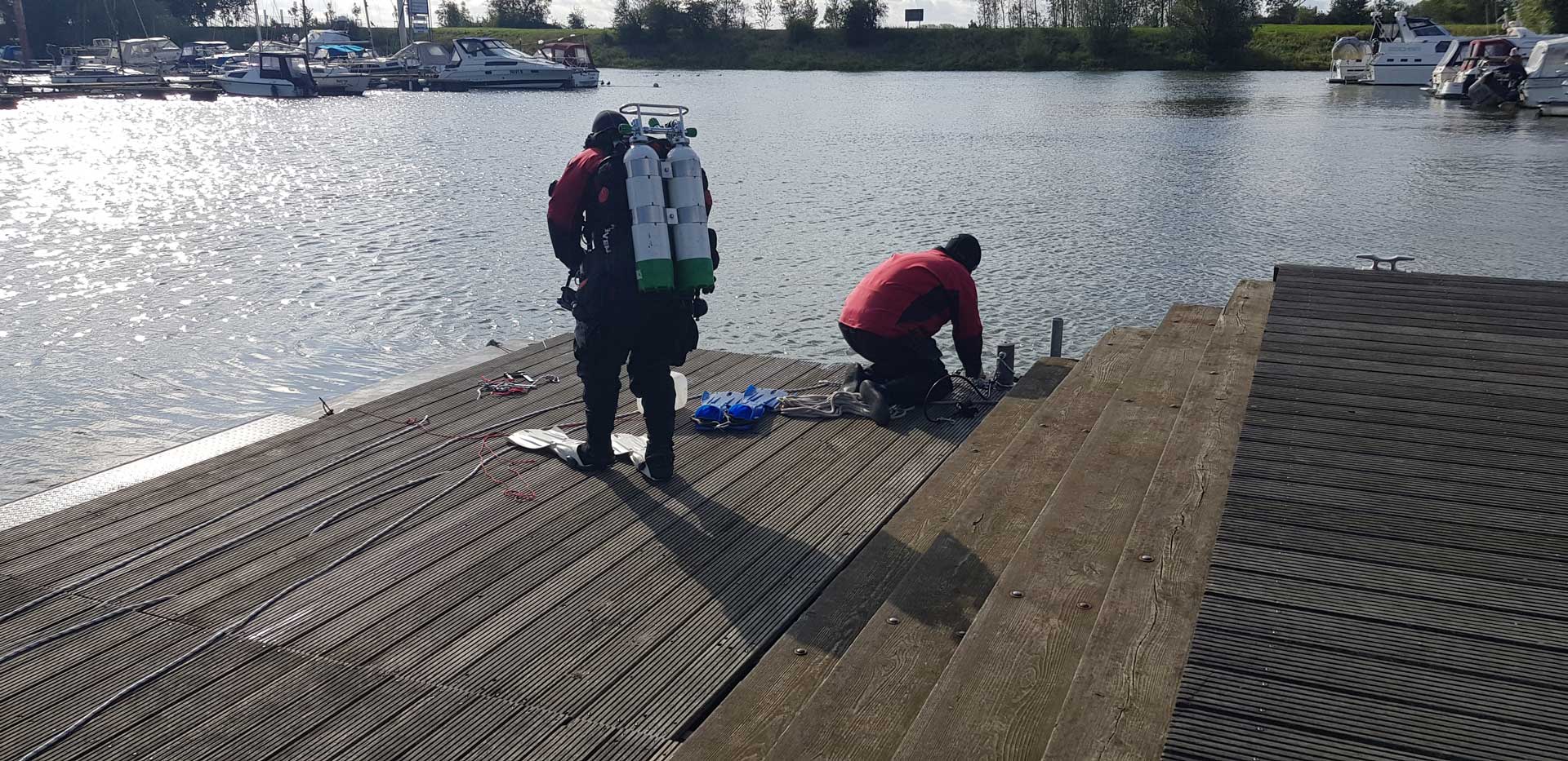 Über ein Jahr ist es her, dass unser abgesoffener Steg mit einem Kran geborgen, anschließend repariert und wieder zu Wasser gelassen wurde. Die bei der Bergung abgerutschen Holzflächen und Bleche konnten bei der ersten Unterwassersuche Dank zweier Weseler Tauchprofis gefunden und geborgen werden. Nur das letzte Trittblech lag noch weiterhin auf dem Grund des Yachthafens. Am Samstagvormittag war es soweit und die beiden Taucher stiegen bei dem letzten richtig guten Wetter nochmals in die schlammige und eiskalte Brühe des Yachthafens. Bereits nach einer Viertelstunde hatten sie das Blech ausgemacht. Inzwischen war es vollkommen im schlammigen Untergrund vergraben. Auf Sicht lässt sich nichts unter Wasser finden, nur das systematische Durchwühlen mit der Hand brachte den Erfolg. Pfiffig, wie die beiden waren, brachten sie Schraubzwingen an das schwere Teil, um es mit daran befestigten Seilen zum Steg ziehen zu können. Echt toll und herzlichen Dank an die beiden Tauchprofis, ohne die wir die versenkten Teile niemals hätten bergen können!
