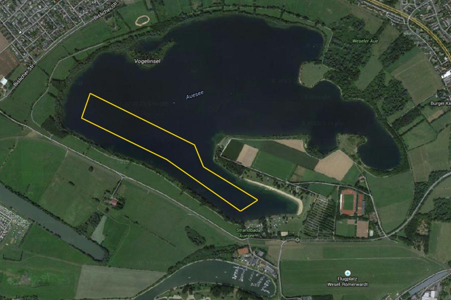 Nur eine festgelegte Anzahl an Trainierenden darf an Wochenenden auf dem Auesee trainieren. Um den Wasservögeln die gewünschte Ruhe zu bieten, wird in dieser Zeit nur die gelb gekennzeichnete Fläche zum Rudern genutzt. Der übrige See ist erst wieder nach Freigabe für alle offen (bis auf die Vogelinsel).